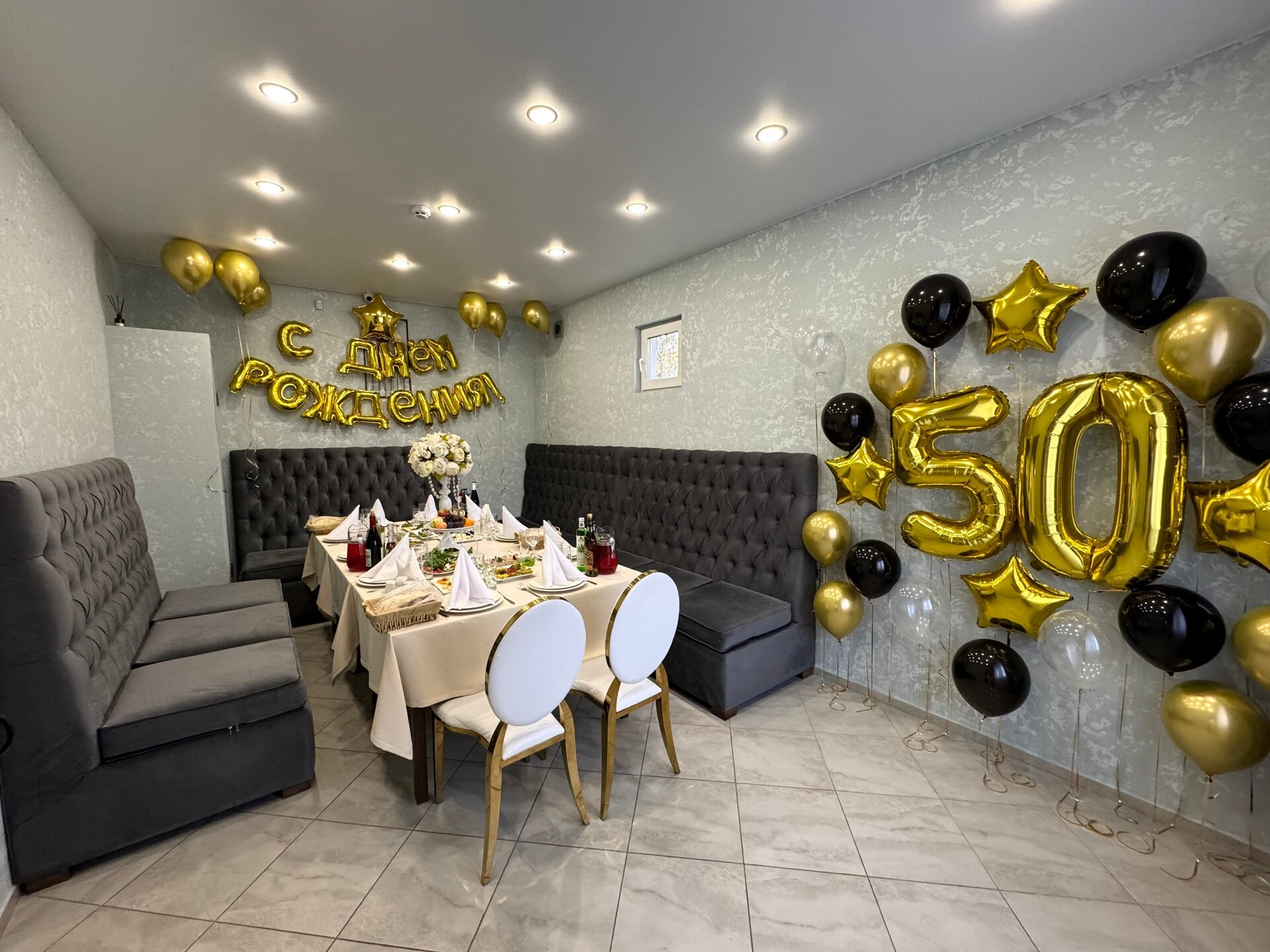 Просторный зал на 100 посадочных мест, украшение зала шарами, цветами, приятная живая музыка, детский аниматор и ведущий торжества.