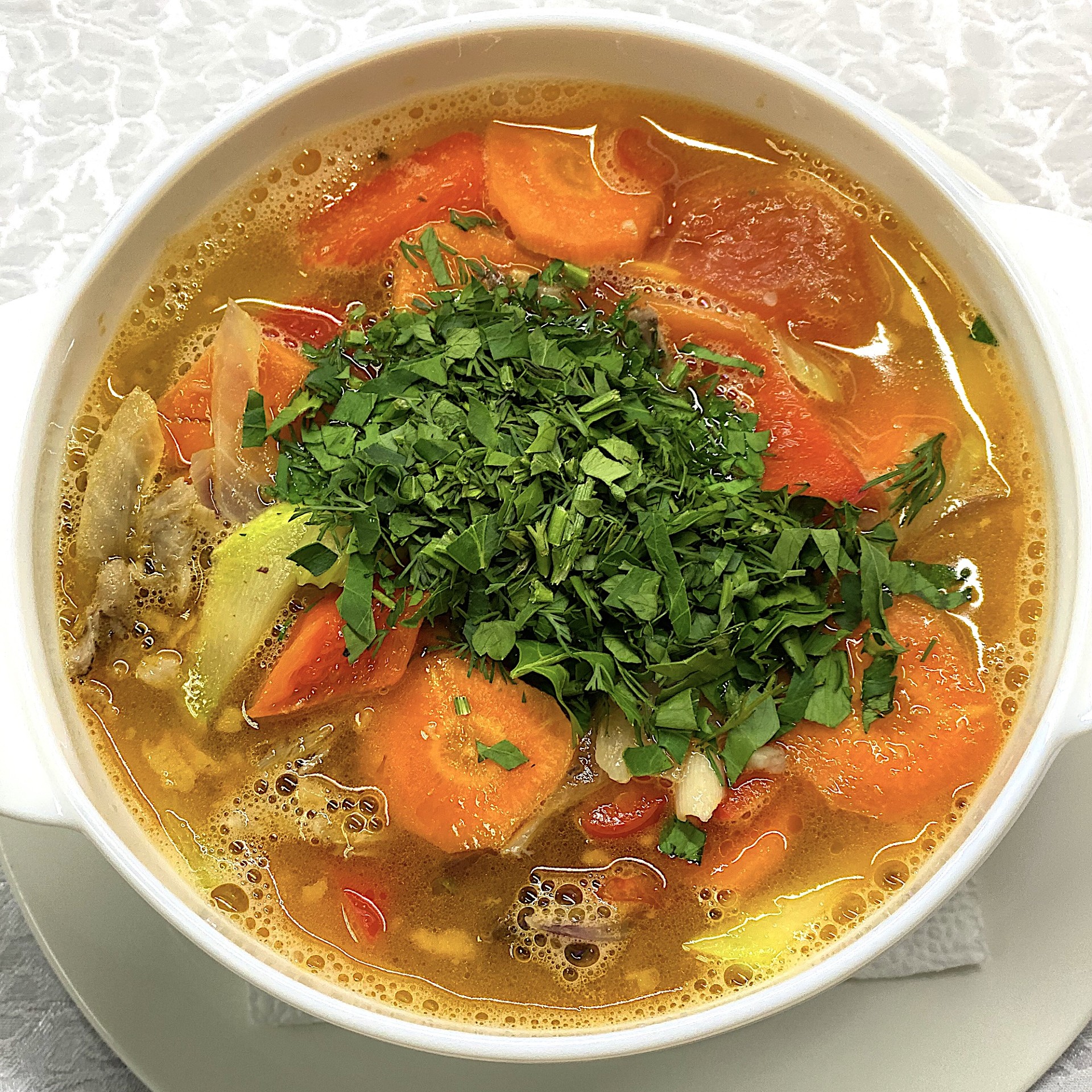 лапша, говядина, баранина, овощи томленые, насыщенный бульон из баранины, зелень