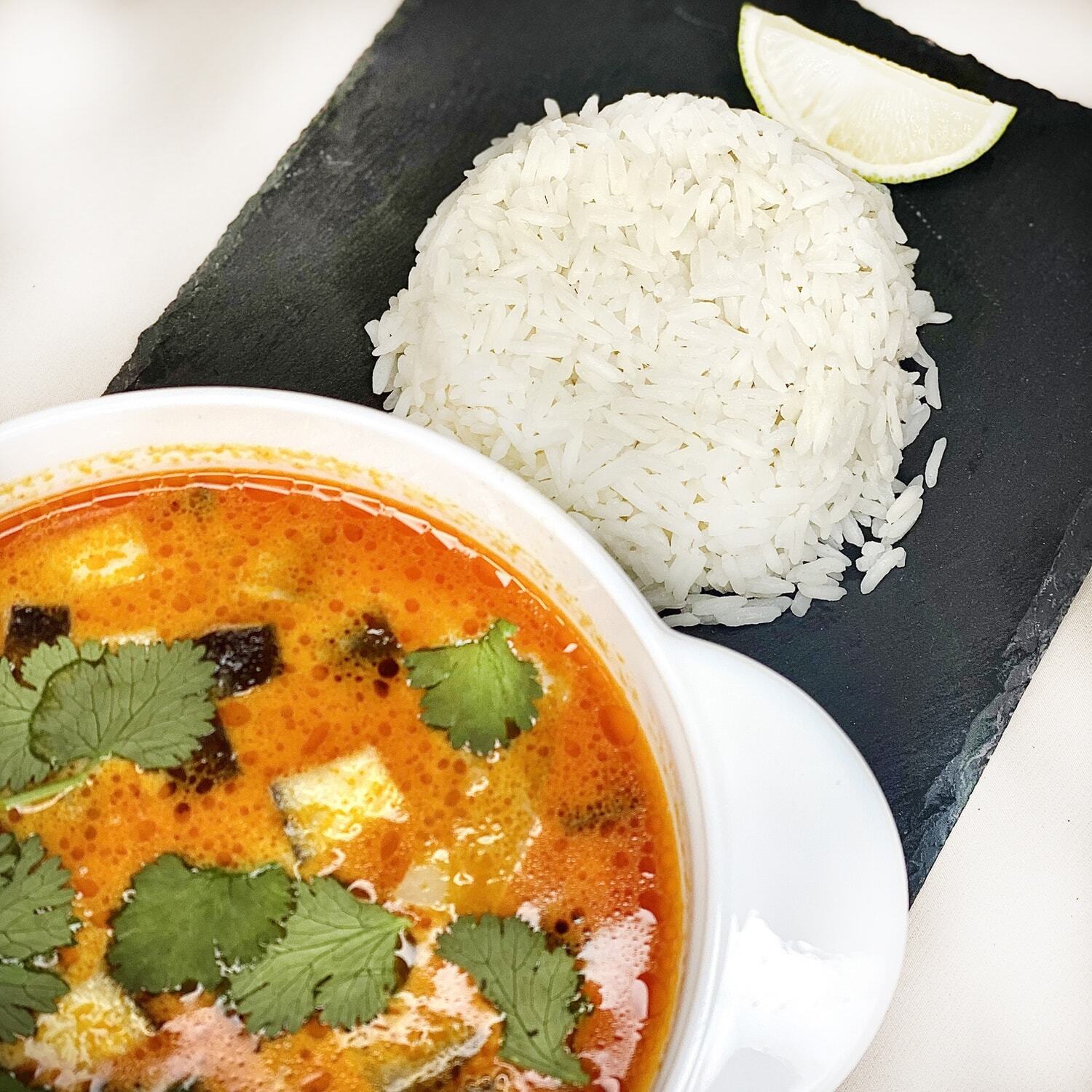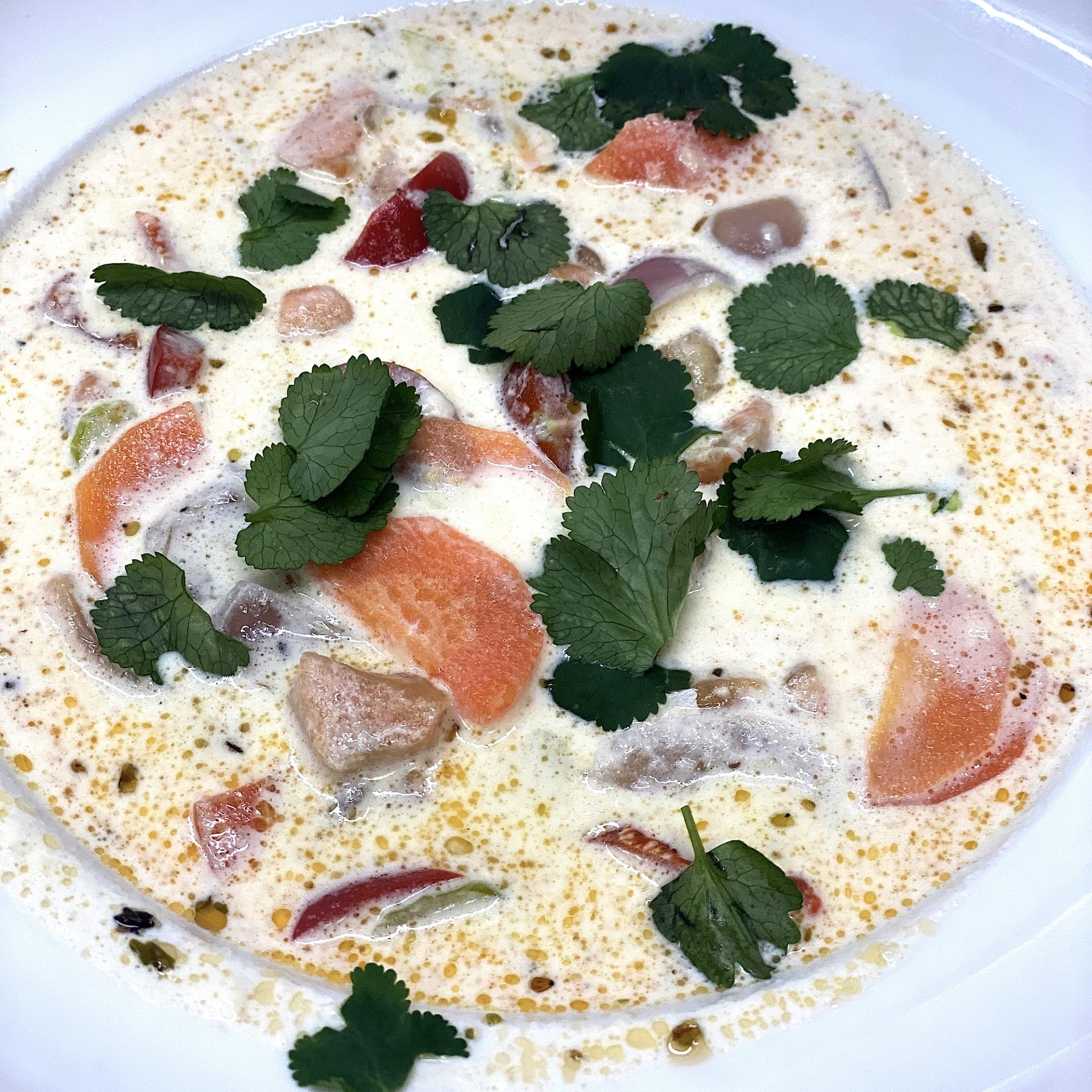 Тайский суп с креветками, кальмарами и шампиньонами  на основе кокосового молока