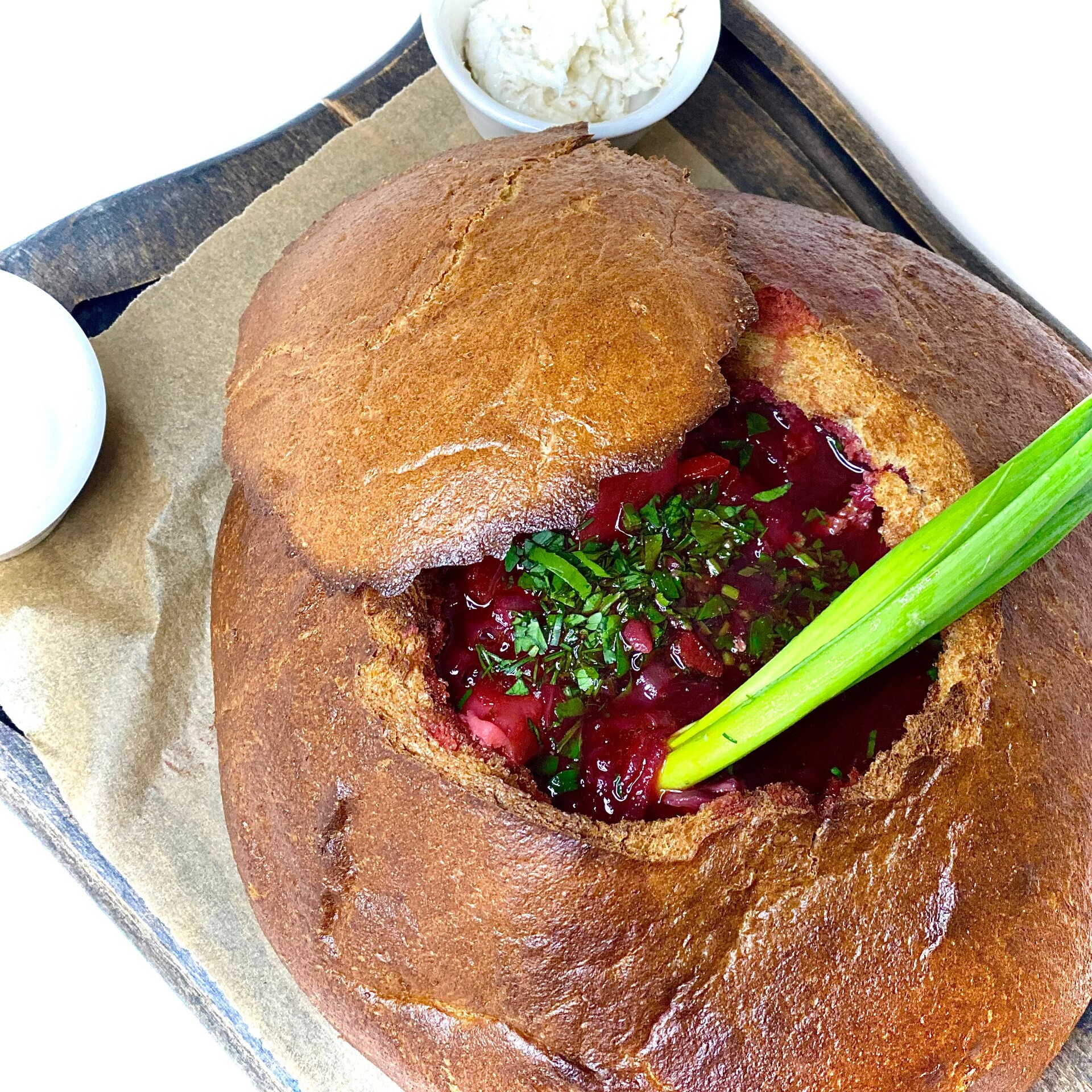 Подается в хлебной булке, со смальцем, сметаной
