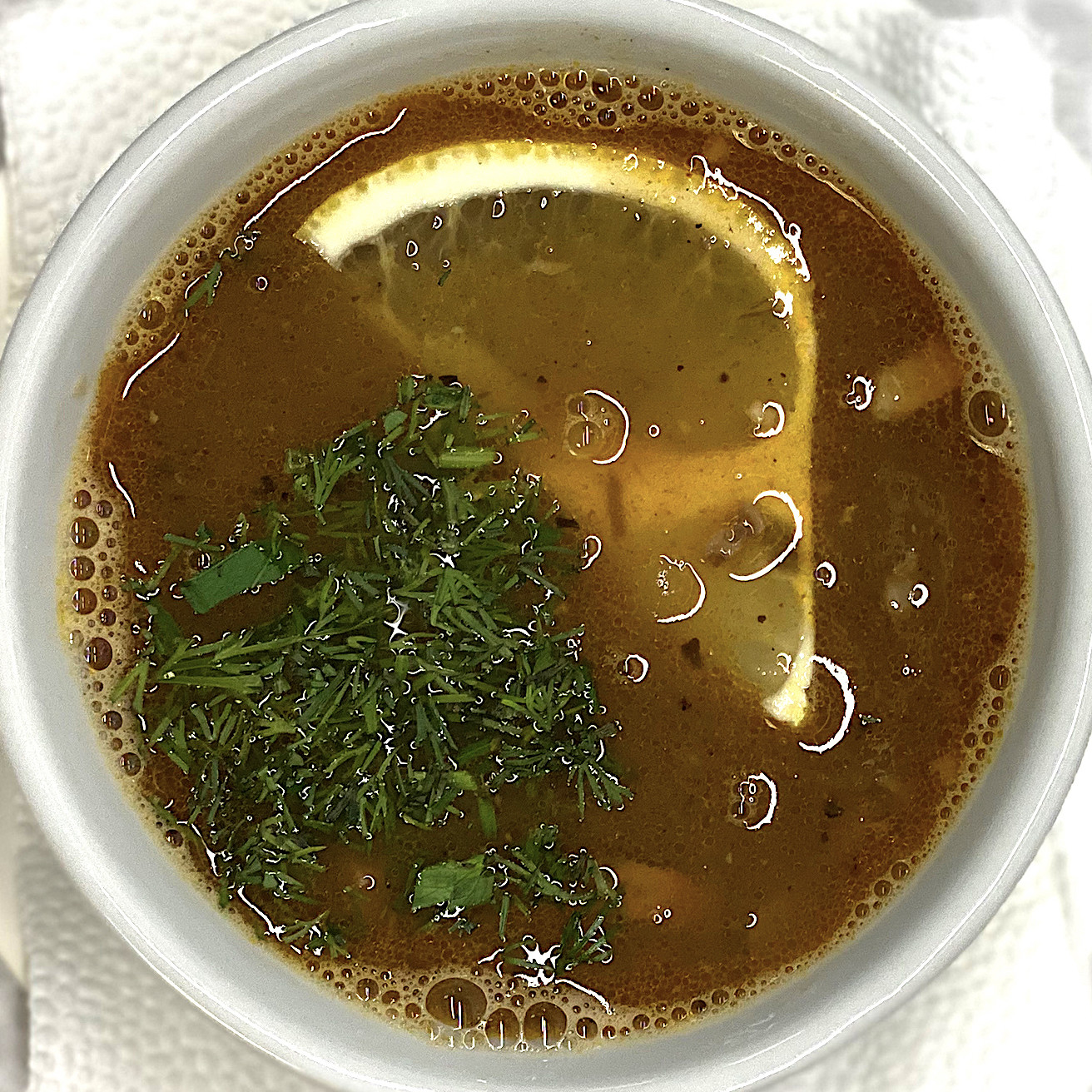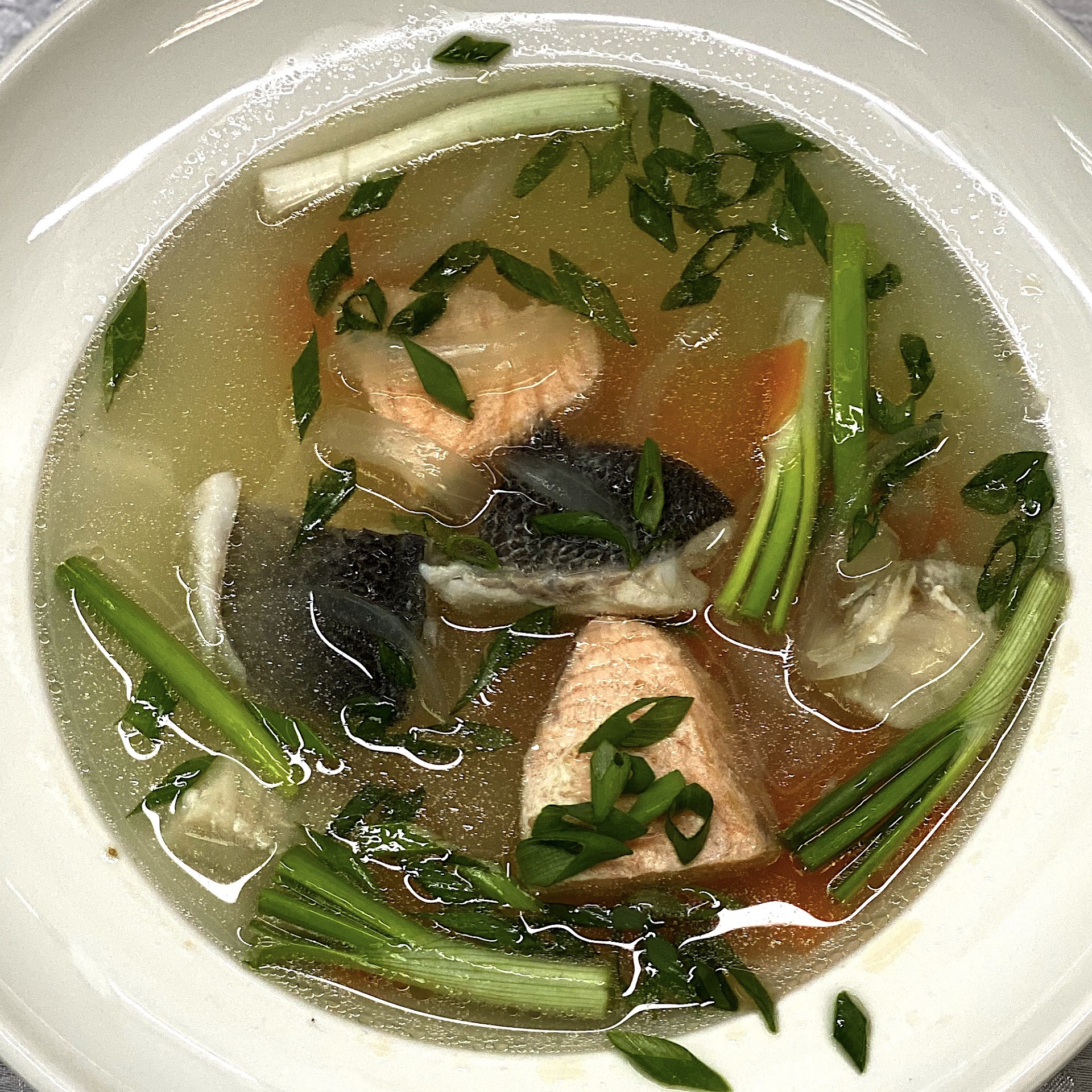 рыбный бульон из разных рыб, семга, сибас, масленая, зелень